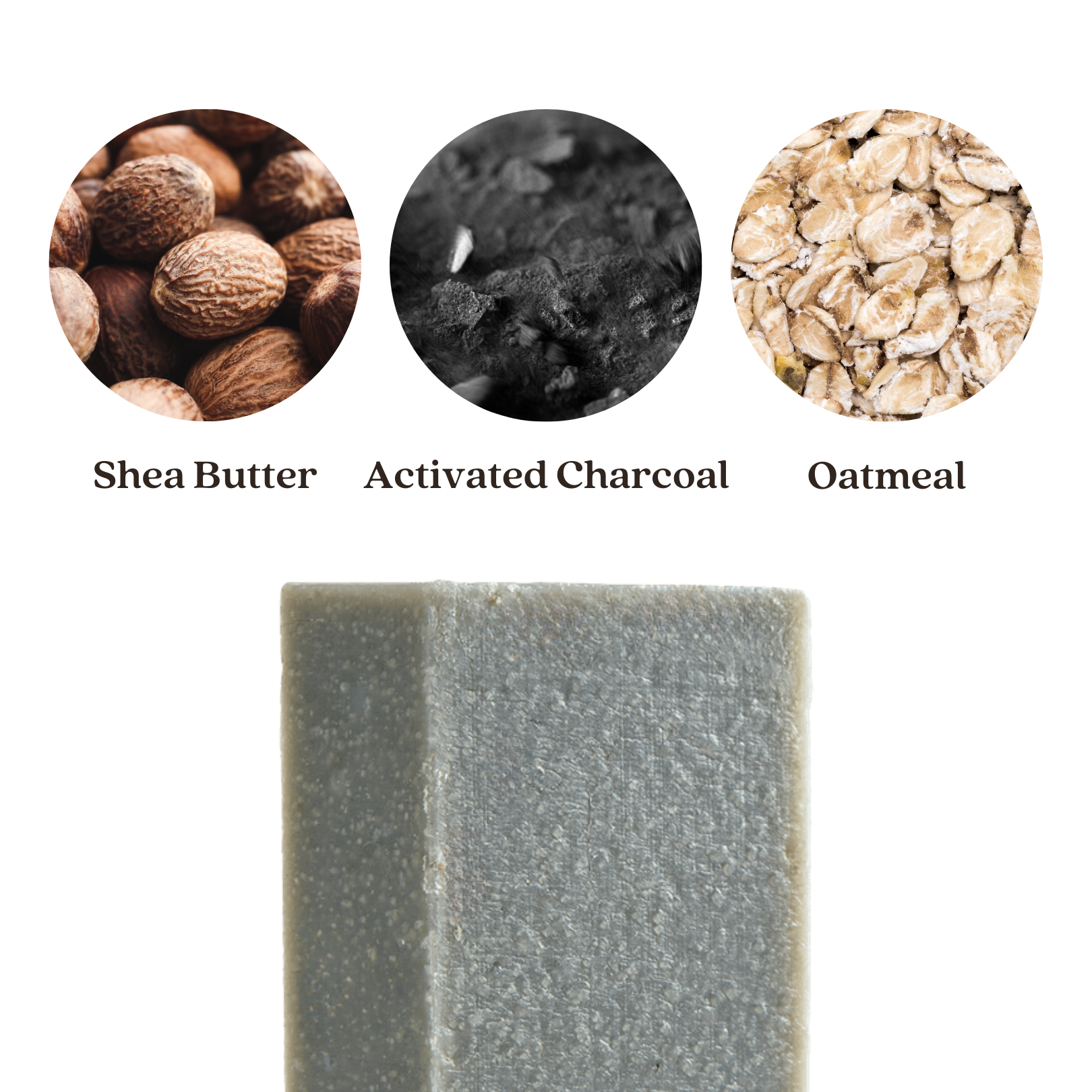 Saponified: *Elaeis Guineensis (Sustainably Sourced Palm) Fruit Oil, Cocos Nucifera (Coconut) Oil, Olea Europaea (Olive) Fruit Oil, Ricinus Communis (Castor) Seed Oil, Butyrospermum Parkii (Shea) Nut Butter, Persea Gratissima (Avocado) Fruit Oil, Kaolin Clay, Oatmeal Flake, †Carbo Activatus (Activated Charcoal) Powder, Sodium Chloride (Sea Salt),*RSPO Certified Sustainably Sourced, †Derived From Coconut Husks