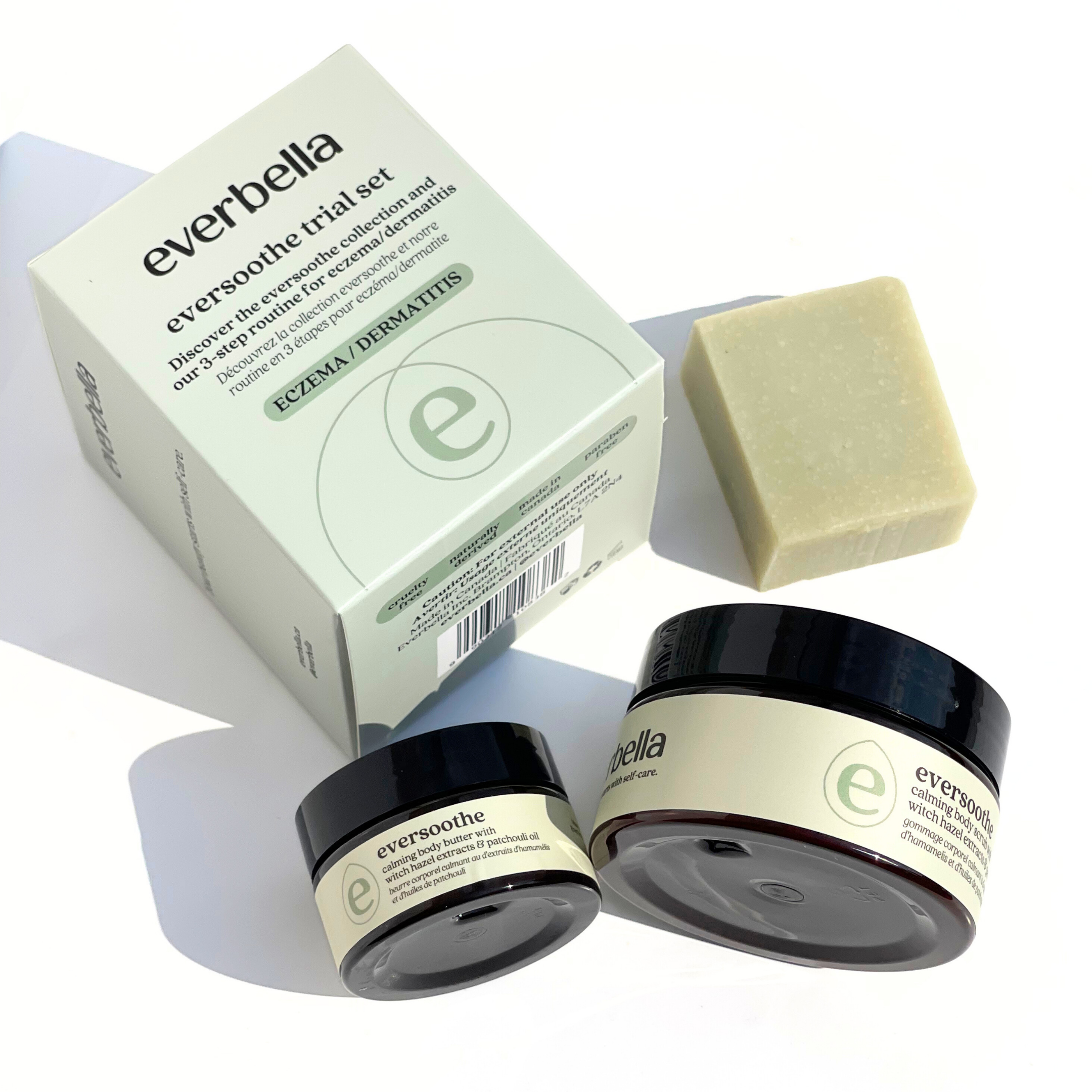 This 30-day customized trial set includes trial sizes of the Eversoothe Soap Bar, Body Scrub, and Body Butter, formulated to address irritations and flare-ups from eczema, psoriasis, dermatitis, or post-skin trauma.